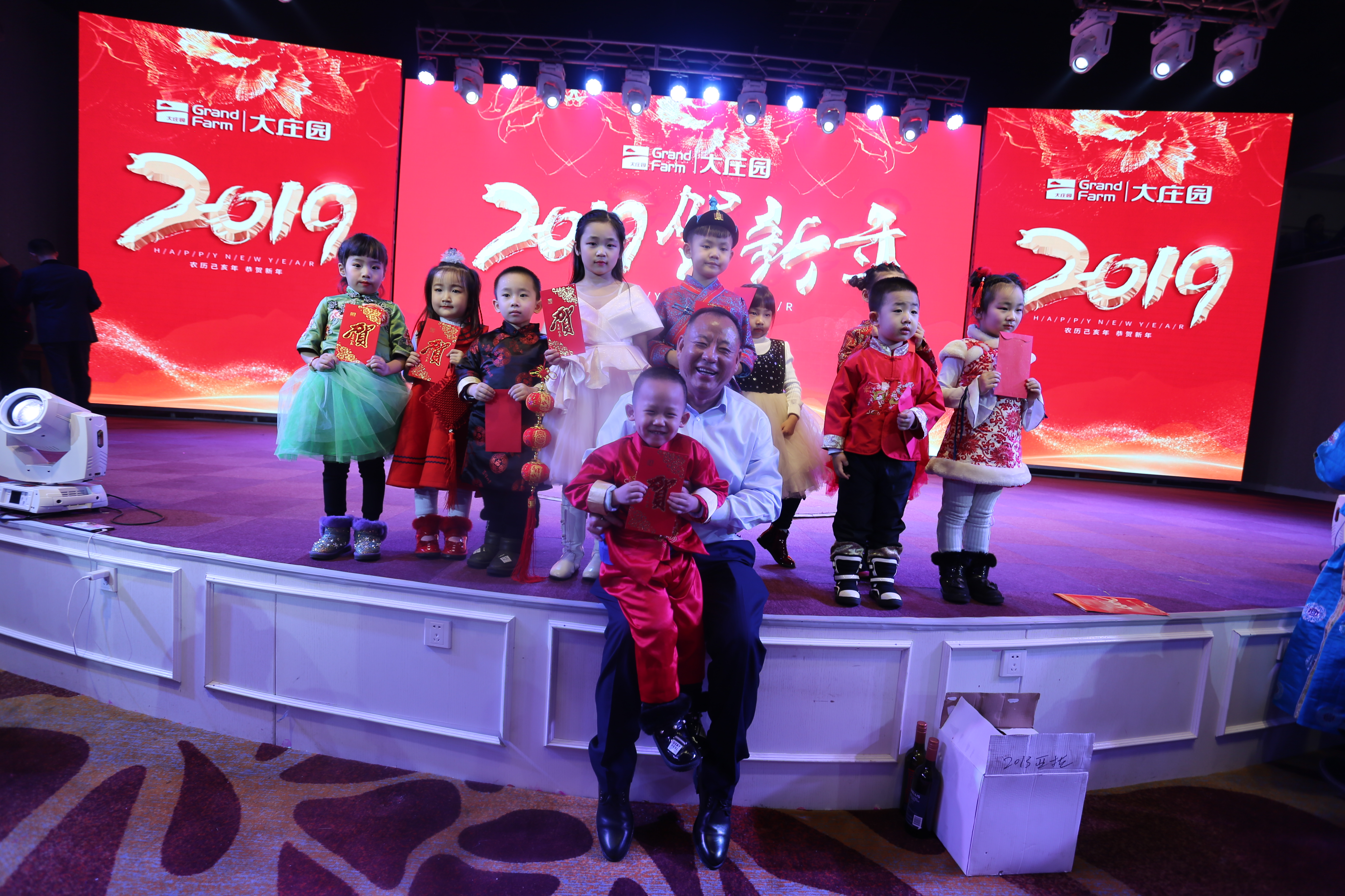 晚會的第一個高潮出現在董事長致辭之后的歌曲聯唱《莊園獻禮》,聯唱的最后,當10名莊園萌寶手拉手從幕后走出,用他們稚嫩的聲音大聲喊出“祝陳爺爺身體健康,大家新年快樂,Happy New Year”的時候,瞬間點燃了全場的氣氛,自然而然的,他們都得到“陳爺爺”親手送出的紅包。